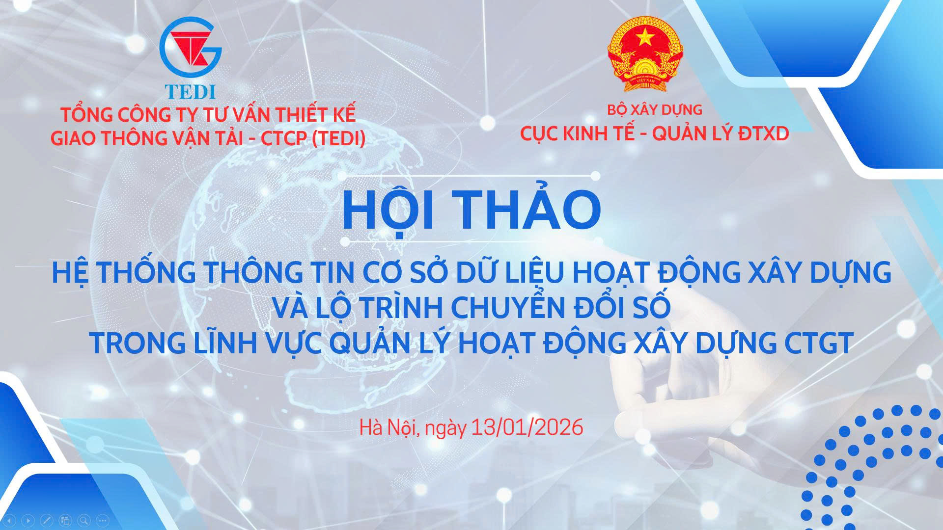 Sáng ngày 13/01/2025, Tổng công ty Tư vấn thiết kế Giao thông vận tải – TEDI đã phối hợp với Cục Kinh tế Quản lý đầu tư xây dựng (Bộ Xây dựng) tổ chức Hội thảo với chủ đề “Hệ thống thông tin cơ sở dữ liệu hoạt động xây dựng và lộ trình chuyển đổi số trong lĩnh vực quản lý hoạt động xây dựng công trình giao thông”.