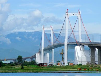 Được khởi công từ năm 2003 với chiều dài 1.850m (riêng phần cầu treo dài 650m), rộng 18m cho 4 làn xe, khoảng cách giữa hai trụ 405m, hai trụ tháp cao 92m, tĩnh không…
